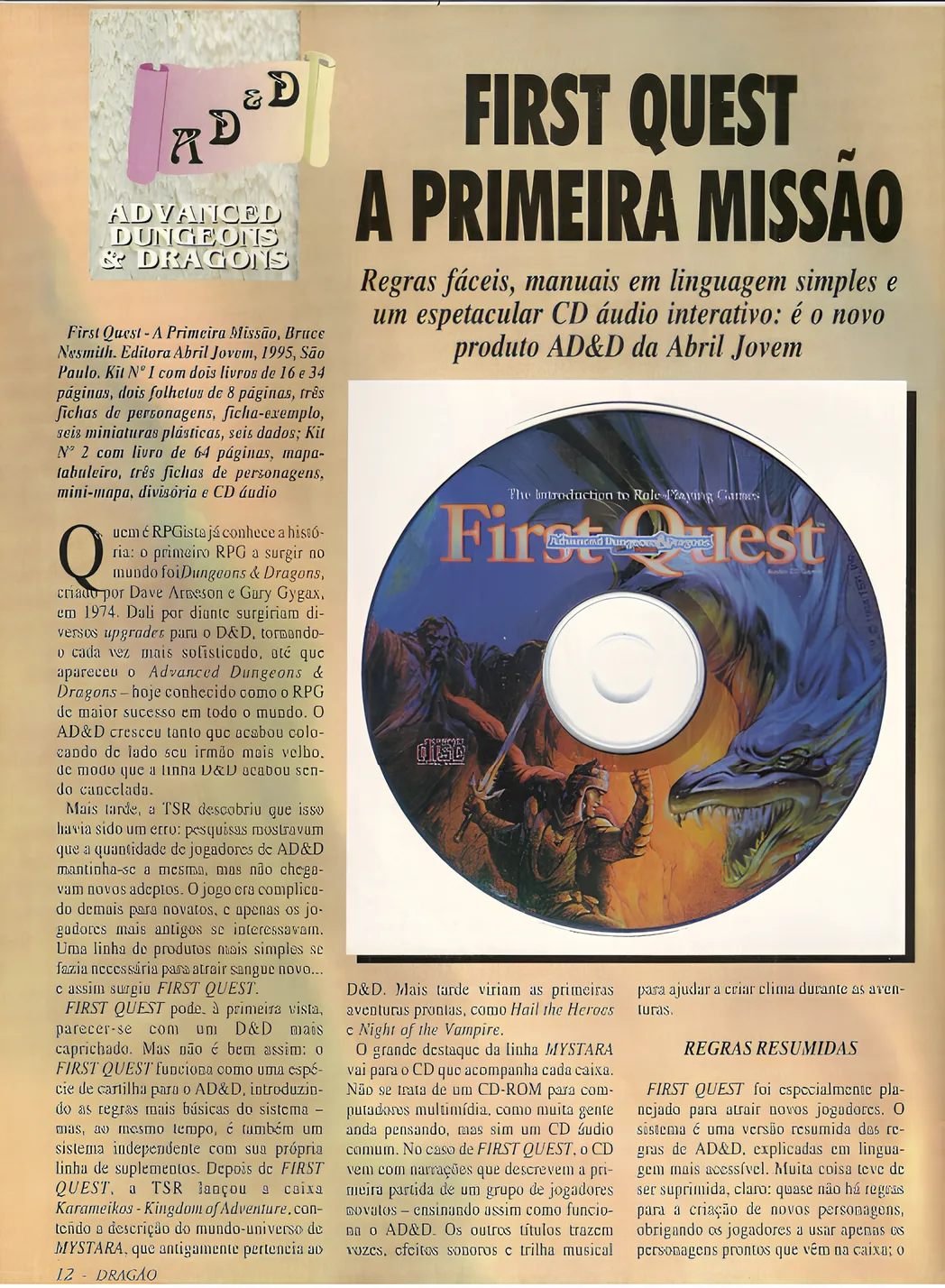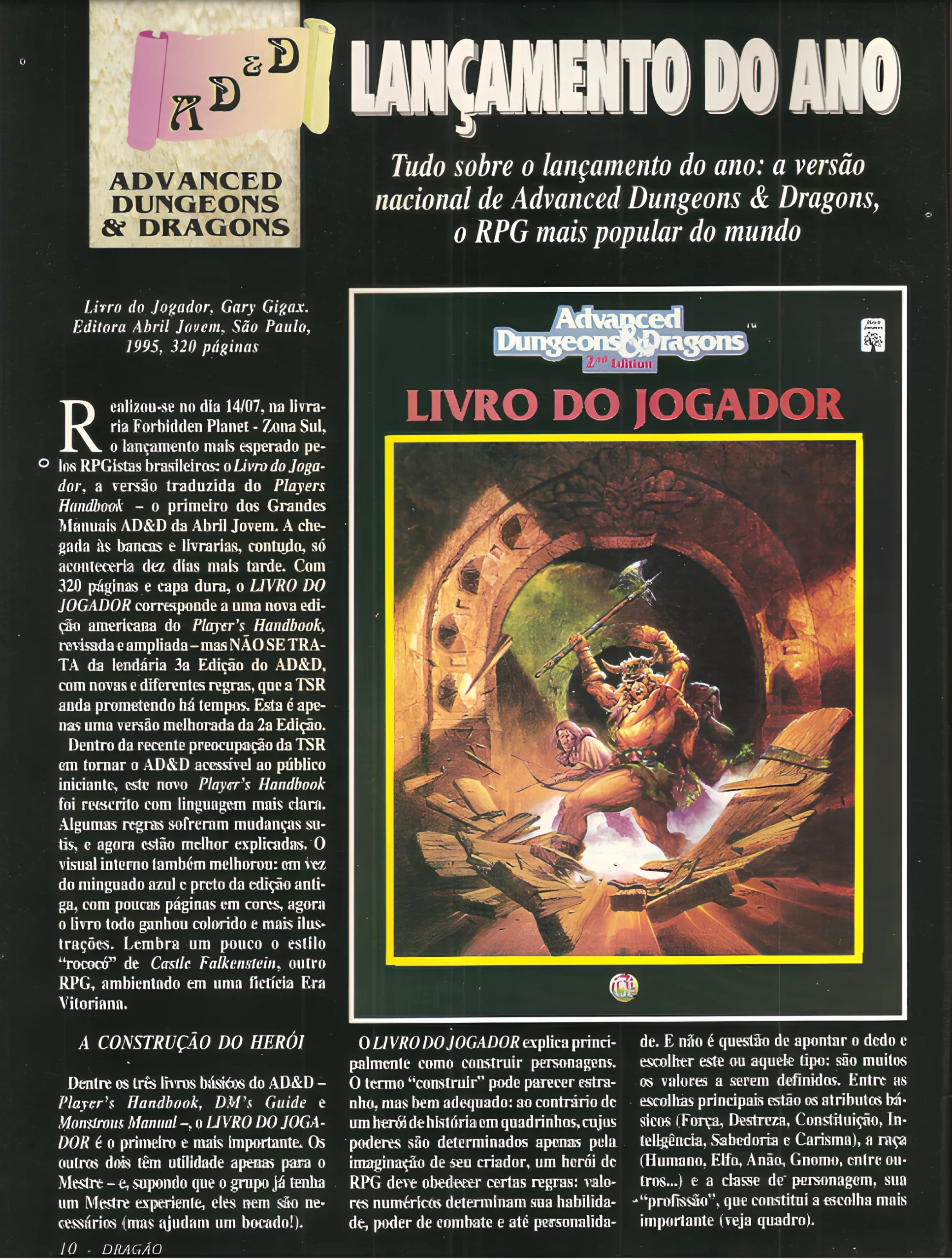 A revista Dragão Brasil RPG também trás a apresentação da coletânia, ” 0 Livro do Jogador” para ” Advanced Dungeons & Dragons“ (AD&D). O “Livro do Jogador” ( Player’s Handbook ) é um dos três livros básicos do sistema, ao lado do ” Dungeon Master’s Guide ” (Guia do Mestre) e do “Monster Manual” ( Manual dos Monstros). O Livro do Jogador contém todas as regras possíveis para os jogadores criarem e desenvolverem seus personagens no mundo do jogo. Isso inclui informações sobre raças jogáveis, classes de personagens, habilidades, magias, equipamentos, e outras mecânicas fundamentais para a jogabilidade. É uma referência essencial para os jogadores que desejam entender e participar do jogo de RPG de mesa.